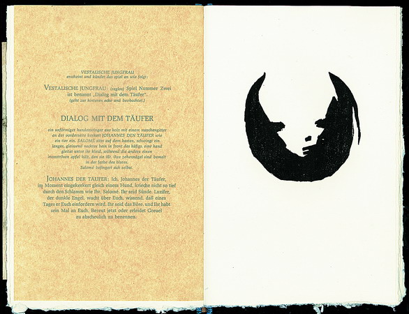 Im Berliner »Tacheles« fand 1993 die deutsche Erstaufführung der »Salomé« von Nick Cave statt. Der Londoner Autor und Musiker ist vor allem durch seine Band »Bad Seeds« bekannt geworden. Die deutsche Musikszene kennt Nick Cave u. a. durch seine Zusammenarbeit mit Blixa Bargeld von der Gruppe »Einstürzende Neubauten«. Am Bühnenbild der Berliner Salomé-Aufführung hat der Chemnitzer Künstler Carsten Nicolai mitgewirkt. Aus dieser Zusammenarbeit entstand das vorliegende Buchprojekt, in dem er Zyklen und Bildfindung des Bühnenbildes aufgegriffen und verarbeitet hat. Der Druck erschien in einer einmaligen Auflage von 107 Exemplaren; 72 arabisch nummerierte sind zum Verkauf bestimmt, 35 Künstler- und Verlegerexemplare wurden römisch nummeriert. Das Impressum ist von Autor und Künstler signiert. Format: 27,5 x 18 cm, 28 Seiten. Der Handsatz in der Leipziger Antiqua erfolgte bei Hahndruck Kranichfeld. Winfried Henkel besorgte den Druck der Holzschnitte. Cornelia Ahnert fertigte den Handeinband. |
