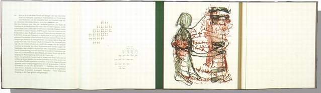Das gemeinsame Buchprojekt geht auf eine Begegnung der beiden Künstler im Frühjahr 1991 zurück. Angeregt von drei Materialbüchern des Leipziger Künstlers (DEPOT, LECTION, MAGISCHE TÖPFE) verfasste Friederike Mayröcker den elfteiligen Textzyklus. Dieser bildet nun die Grundlage für die Gestaltung des Buches, wird selbst Material für die Arbeiten von Olaf Nicolai. In dieser Form werden die »klassischen« Rollen des Autors und des Illustrators neu verteilt. Zwei gegenständige Buchblöcke lassen durch Ausstanzungen und Mehrfachfaltungen der Seiten ungewöhnliche Möglichkeiten zum Lesen und Betrachten des Buches zu. Der Druck erschien in einer einmaligen Auflage von 140 Exemplaren; 100 arabisch nummerierte sind zum Verkauf bestimmt, 40 Künstler- und Verlegerexemplare wurden römisch nummeriert. Das Impressum ist von Autorin und Künstler signiert. Format: 33 x 29 cm, 84 Seiten. Der Handsatz in der Garamond erfolgte bei Hahndruck Kranichfeld. Klaus Göbel besorgte den Druck der Lithografien. Den Handeinband entwarf und gestaltete Cornelia Ahnert. |