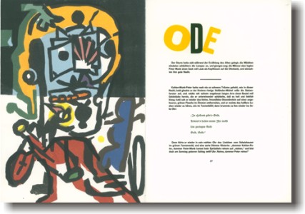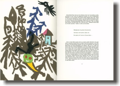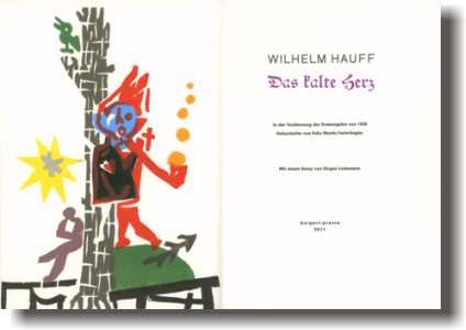 Veröffentlichung im Jahre 1828 offenbar nicht mehr erlebt. Der Druck erscheint im IV. Quartal 2011 in einer einmaligen Auflage von 50 Exemplaren; 44 arabisch nummerierte Exemplare sind zum Verkauf bestimmt, 6 Künstler- und Verlegerexemplare werden römisch nummeriert. Das Impressum ist vom Künstler signiert. Format: 36 x 26 cm, 104 Seiten. Der Druck des Textes in Bleisatz erfolgt bei Harald Weller, Berlin. Felix Martin Furtwängler und Harald Weller übernehmen den Druck der Holzschnitte. Den Handeinband fertigt Ludwig Vater, Jena. |