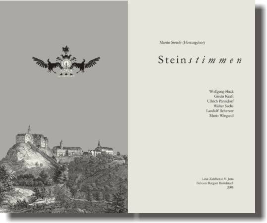 Autoren, Künstler und Komponist gehen 2005 auf eine Entdeckungsreise zu drei thüringischen Burgen. Sie besuchen die majestätisch über Rudolstadt thronende Heidecksburg, die traurig anmutenden Ruinen der Schwarzburg und die sagenumwobene Burg Ranis. Die entstandenen Texte, die Bilder und Noten sind nun in dieser bibliophilen Ausgabe vereint, korrespondieren miteinander und erweitern das eigene ästhetische Geviert. Das Experiment des Initiators und Herausgebers Martin Straub ist geglückt: ein Zusammenklang der Künste ist in Buchform entstanden. Ein Projekt der Kulturstiftung des Freistaates Thüringen und Lese-Zeichen e.V. Jena. 100 Verkaufsexemplare, 30 x 18 cm, 72 Seiten, englische Broschur, mit je drei zweifarbigen Originalserigrafien von Walter Sachs und Ullrich Panndorf, von den Autoren, Künstlern und dem Komponisten im Impressum signiert Preis: 98,00 €